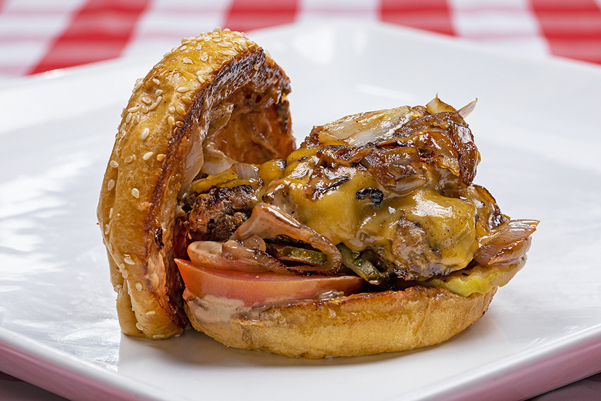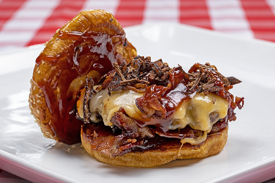 1/3lb American Wagyu Rib Eye Ground Beef • Cherrywood Bacon • Fried Baby Shallots • White Sharp Cheddar • American Cheese • BBQ Sauce • Parmesan Crusted Brioche Bun