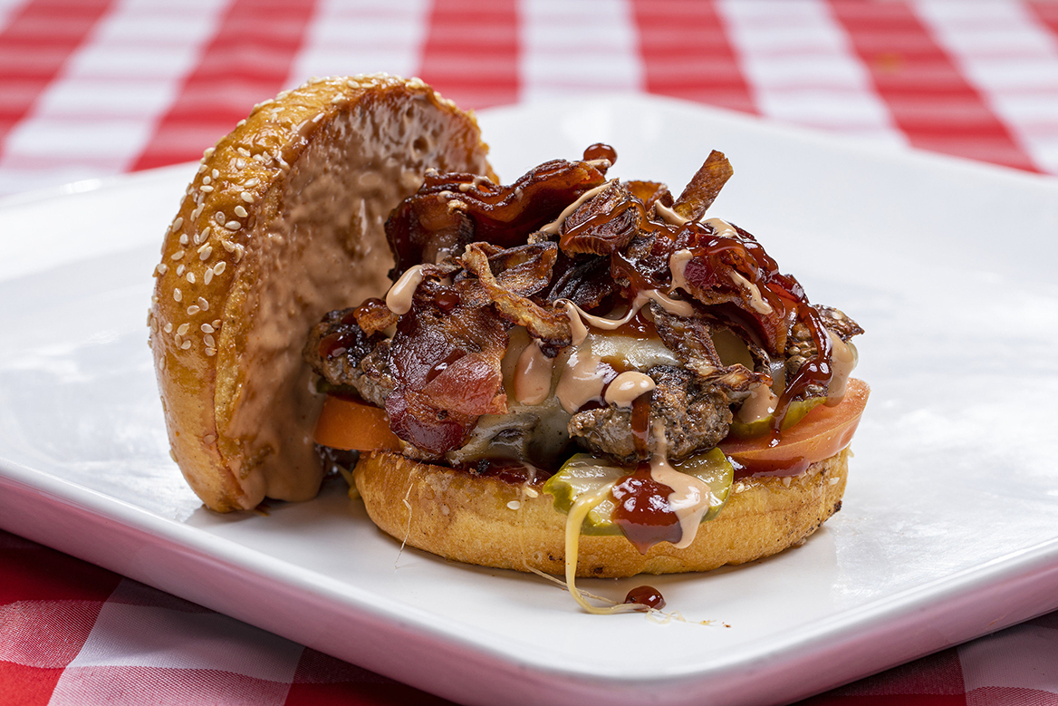 Chef RVT’s Award Winning burger, known as “the best burger I’ve ever had!” 1/3lb American Rib Eye Wagyu Ground Beef • Cherrywood Bacon • Roma Tomato • Dill Pickle • Fried Shallots • American Cheese • White Cheddar Cheese • Secret Sauce • BBQ Sauce • Parmesan Crusted Brioche Bun