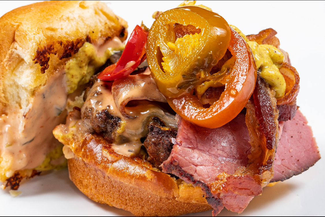 American Rib Eye Wagyu Ground Beef • Thick Cut Grilled Pastrami • Pickled Cherry Peppers • Dill Pickles • American Cheese • Spicy Mustard • Secret Sauce • Parmesan Crusted Brioche Bun (available as a slider or Chef’s Special Burger)
